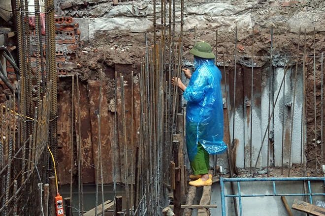 | Một công nhân xây dựng mặc áo mưa để giữ ấm khi làm việc ngoài công trình. |