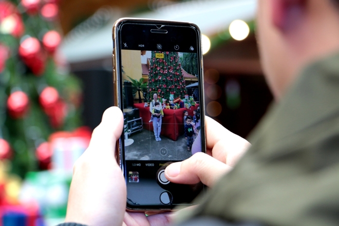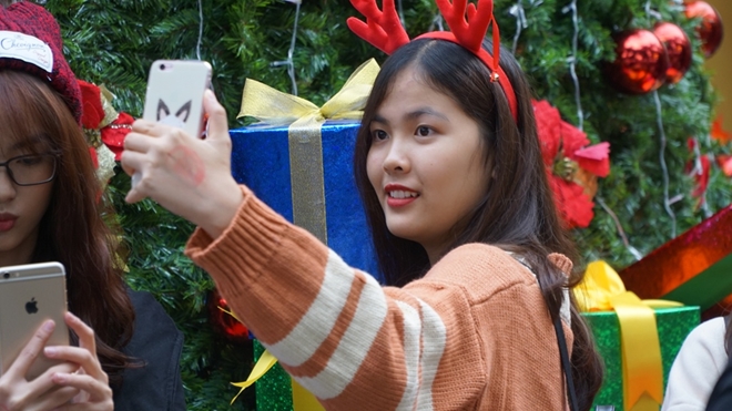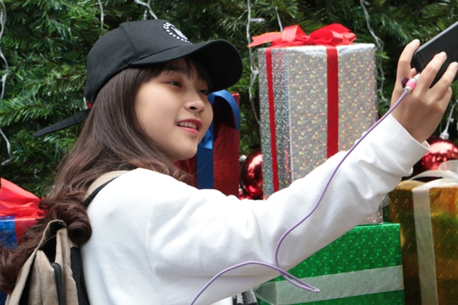 Các bạn trẻ không quên lưu lại những khoảnh khắc trong đợt Giáng sinh này dưới cây thông Noel trang trí rực rỡ.