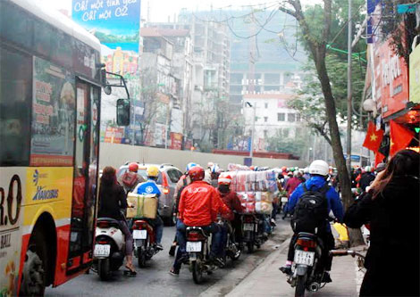 Trong bán kính 1km, các phương tiện đều phải tham gia giao thông với tốc độ rất chậm. Diện tích đường hẹp nên các loại phương tiện đều phải chen chúc nhau, các khoảng trống trên vỉa hè đều được người tham gia giao thông, đặc biệt là xe gắn máy tận dụng triệt để.