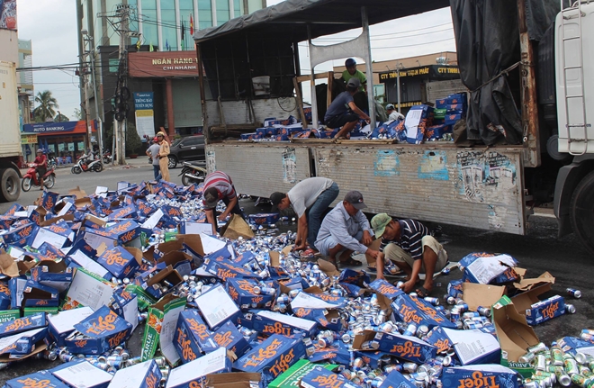 Người dân Mỹ Tho giúp tài xế gom hàng trăm thùng bia đổ ra quốc lộ