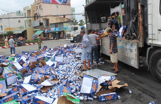 Vụ việc xảy ra vào trưa 12-1. Xe tải chở đầy bia mang biển kiểm soát 65C 04341 lưu thông trên quốc lộ 1 theo hướng từ Mỹ Thuận về TP Hồ Chí Minh. Khi đến vòng xoay Trung Lương (thuộc phường 10, TP Mỹ Tho), tài xế cho xe tải ôm cua thì thùng xe tải bị bung. Hàng trăm thùng bia trên xe tải đổ xuống đường văng tung toé.