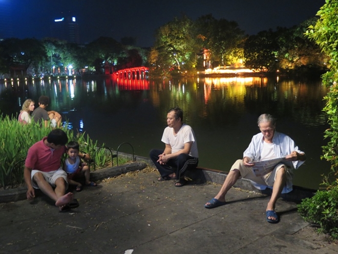 Không còn ghế để ngồi, nhiều người ngồi ngay mép hồ để tâm sự, đọc báo và hóng gió. |