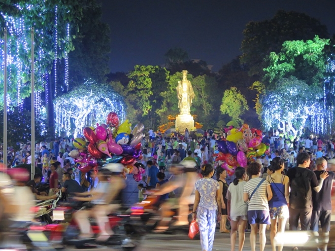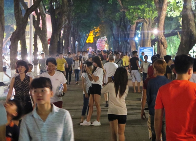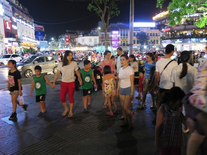 Khu vực ven hồ Gươm về đêm chật kín người đi lại sau một ngày nắng nóng, oi bức. |