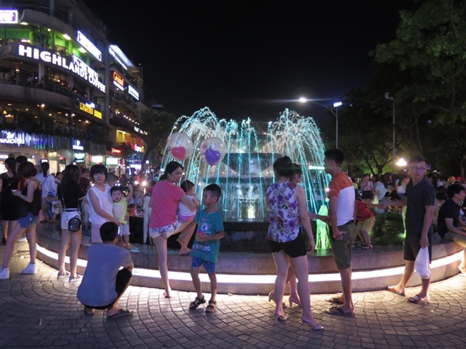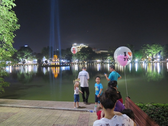 Về đêm, nhiều gia đình cho con lên khu vực hồ Gươm để hóng gió và vui chơi. |