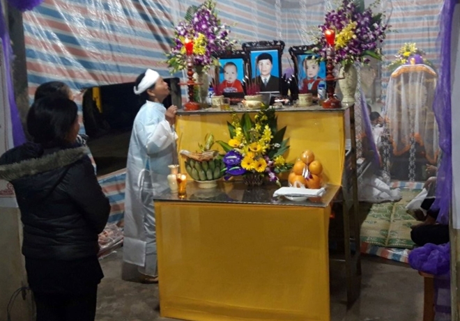 Đứng trước bàn thờ vừa được lập vội với 3 di ảnh con trai và 2 người cháu nội, bà Nguyễn Thị Tư (mẹ ruột anh Tân) nghẹn ngào trong từng tiếng khóc.