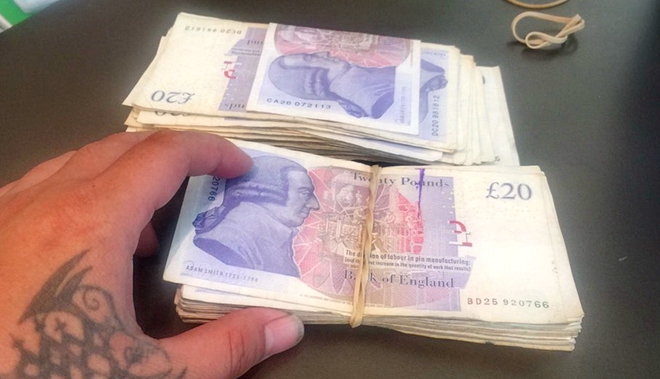 | 96 tờ tiền gồm 1.900 bảng Anh do anh Lê Thanh Tú nhặt được. |