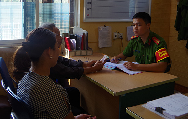 | Ông Thắng và chị Hòa mang số tiền nhặt được đến Công an xã Phương Chiểu giao nộp. |