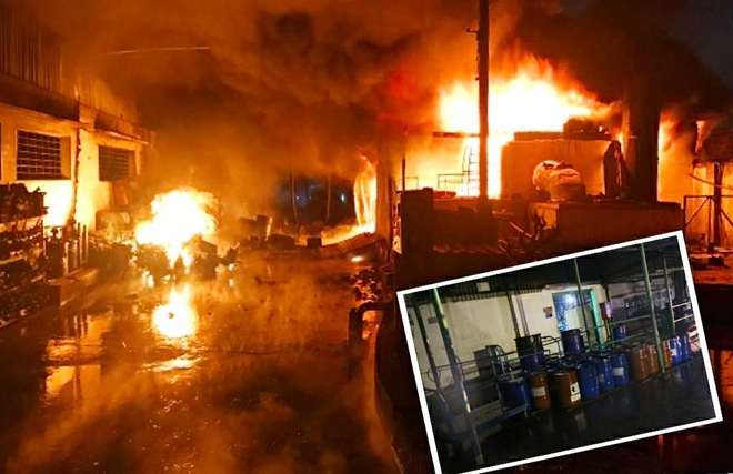 | Vụ cháy tại công ty sản xuất giày dép ở Bình Tân (ảnh lớn) và hóa chất được sắp xếp không đúng quy định (ảnh nhỏ) bên trong công ty. |