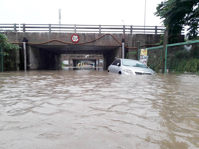 | Đường gom khu vực đại lộ Thăng Long cứ mưa to là ngập nặng. |