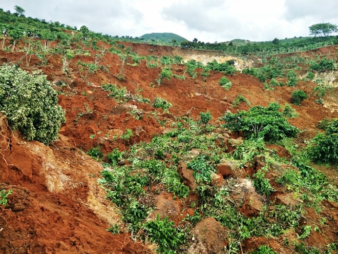 Trong vòng 3 ngày qua đã có thêm 10ha đất tại khu vực này bị nứt trượt, nâng tổng số diện tích bị ảnh hưởng lên trên 20ha trong vòng một tuần và chưa có dấu hiệu dừng lại.