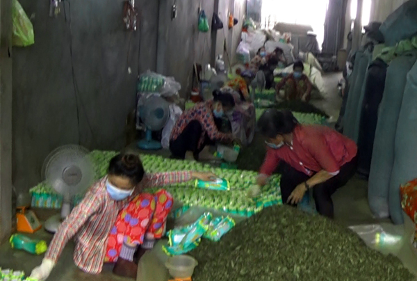 Tại khu vực chế biến trà, có gần 10 công nhân đang làm việc nhưng tất cả không được trang bị bảo hộ vệ sinh an toàn thực phẩm. Những công nhân này đóng trà vào gói bằng thủ công, không đeo bao tay, ngồi trệt dưới nền xi măng, lót tạm giấy bạt, không đảm bảo an vệ sinh.