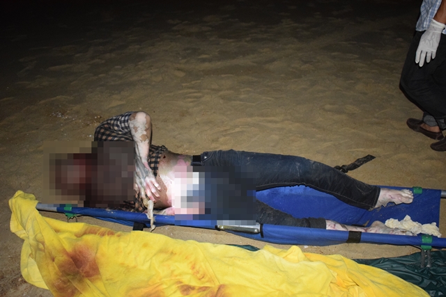 | Thi thể nam thanh niên trôi dạt vào bờ biển thuộc khu du lịch Laguna, xã Lộc Vĩnh. |
