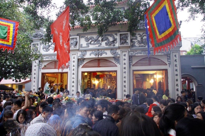 Tương truyền, Phủ Tây Hồ thờ mẫu Liễu Hạnh - 1 trong 4 vị thánh bất tử trong tín ngưỡng của người Việt. Nơi đây nổi tiếng linh thiêng, vì vậy, mỗi dịp đầu xuân mới, hàng vạn người đã hành hương, kính lễ với ước nguyện năm mới an lành, may mắn, mọi việc được thuận buồm xuôi gió.