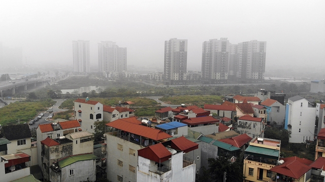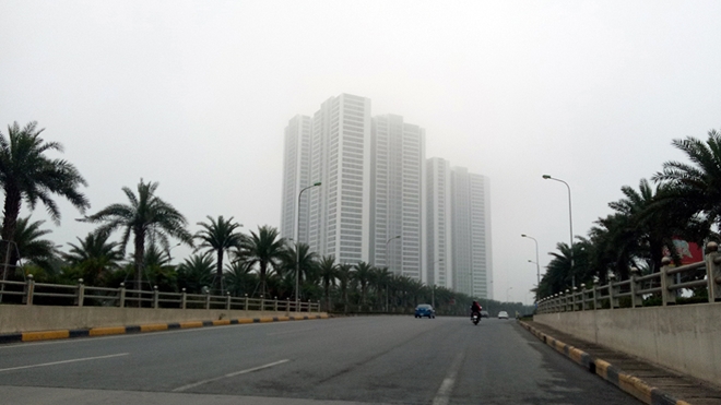 | Đứng từ dưới hầm giao thông Đại Lộ Thăng Long nhìn xa ra những tòa nhà cao tầng hiện đại của thủ đô Hà Nội trong màn sương mờ ảo. |