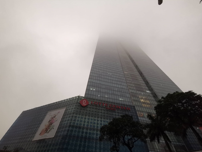 | Trung tâm thương mại Lotte Canter vào thời điểm 6h30 sáng ngày 12-2, sương mù vây kín tòa tháp khiến người đi đường rất khó để nhìn thấy đỉnh tòa nhà. |