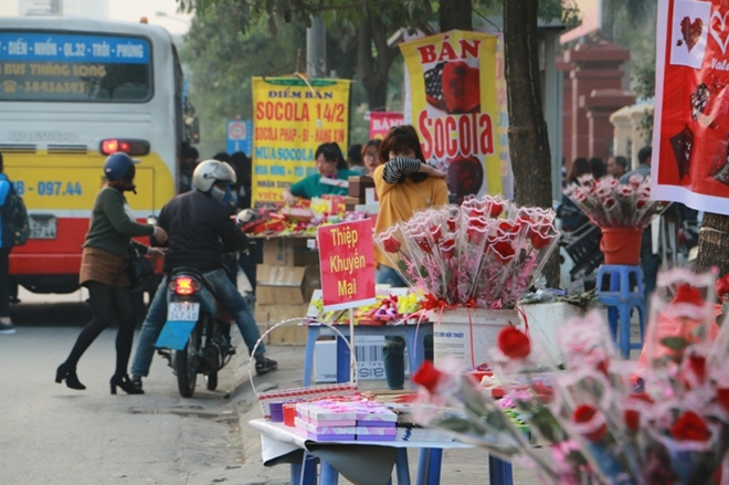 Các con phố, ngã đường thành phố Hà Nội tràn ngập quầy hàng tự phát bày bán quà Valentine trong ngày lễ tình nhân.