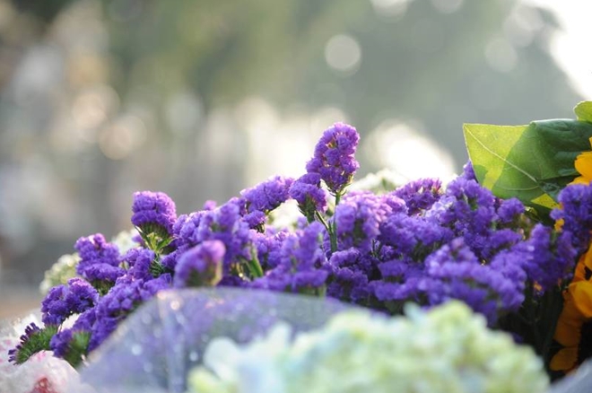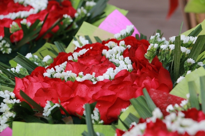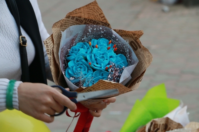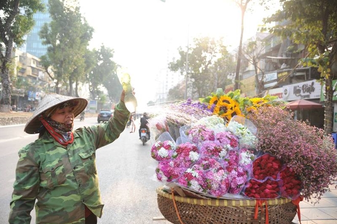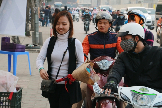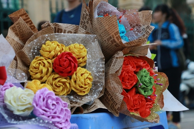 | Các loại hoa sử dụng trong dịp lễ Valentine cũng theo chân các chị bán hàng rong có mặt khắp các con phố trên thủ đô. |