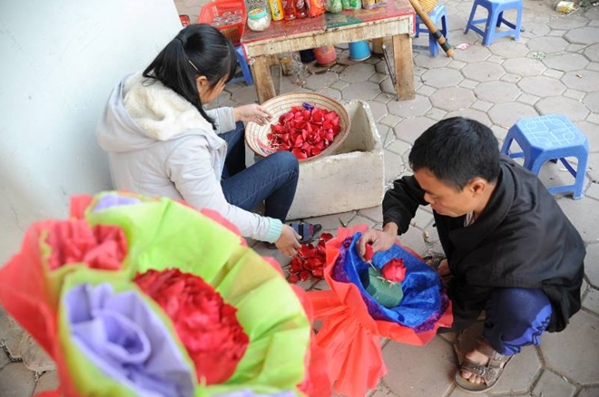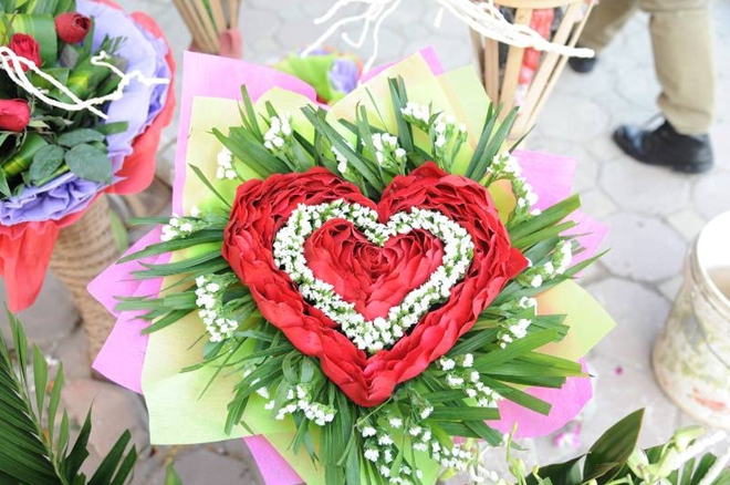 | Ảnh, chị Thư mở một quầy bán hoa vệ đường cho biết "muốn xếp những cánh hoa hồng thành một bó cũng khá tốn thời gian như bó hoa hình trái tim cần mất khoảng 1h thì mới hoàn thành." Giá của một sản phẩm giao động từ 150.000 đến 200.000 đồng/bó. |