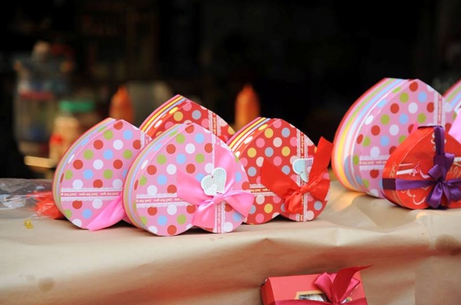 Nhiều loại quà biểu trưng cho Valentine đẹp mắt được bày bán. Một hộp chocolate mang hình ngày hình trái tim có giá 150.000 đồng, được người bán cho là tương đối phù hợp với túi tiền người mua trong ngày lễ Valentine.