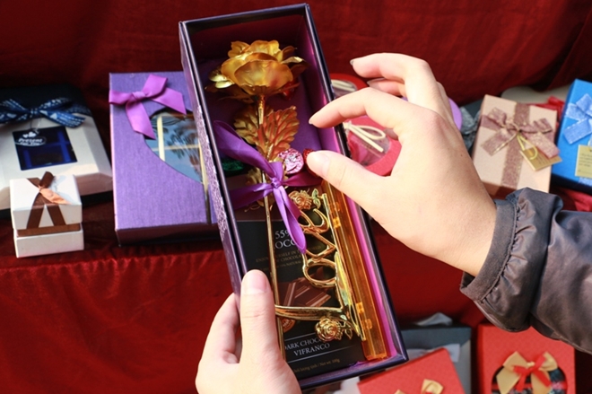 Dạo qua các con đường, ngõ phố, điều dễ dàng nhận thấy đó là tràn ngập của các cửa hàng bày bán hoa hồng đỏ và chocolate, những món quà đã trở thành truyền thống trong ngày này: