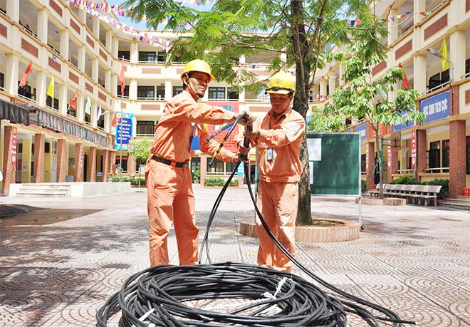 | Thợ điện đang kéo điện vào địa điểm chuẩn bị cho kỳ thi THPT vào ngày 9-6. |