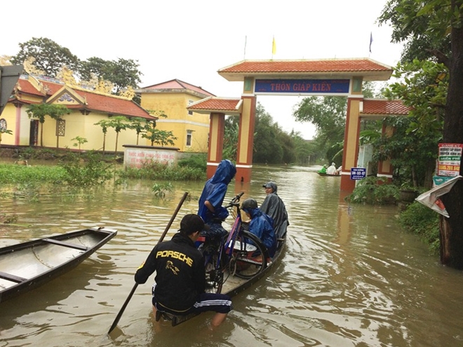 | Người dân ở nhiều địa phương thấp trũng tại huyện Quảng Điền dùng thuyền đi lại do ngập lũ. |