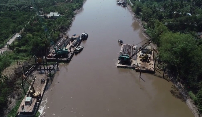 | Tiền Giang xây dựng công trình đắp đập thép ngăn mặn. |