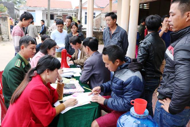 Ngư dân thôn Hà Thôn, xã Bảo Ninh, Đồng Hới, Quảng Bình làm thủ tục nhận tiền đền bù, hỗ trợ do sự cố môi trường biển. |