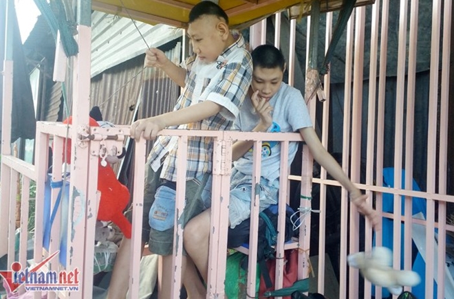 | Chiếc cũi thân thuộc của hai người con bị teo não của anh Hữu Nghị. |