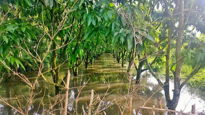 Nhiều diện tích cây ăn trái tại khu vực Cồn Khương bị ngập gốc, nguy cơ thiệt hại vụ trái cây tết.