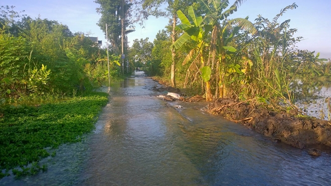 Tuyến đê của khu vực Bình An (phường Long Hòa, quận Bình Thủy) bị nước tràn vào ruộng, gây khó khăn trong việc đi lại của bà con.
