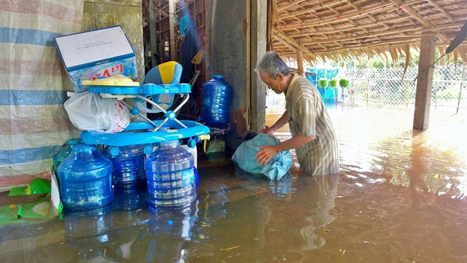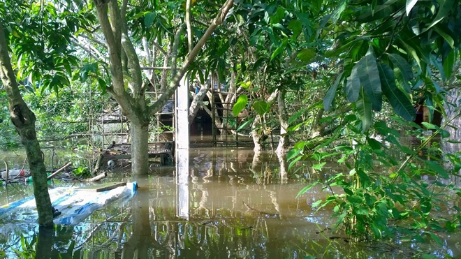 Ông Hên buồn rầu vì nhà cửa và vườn cây ăn trái của gia đình bị ngập sâu.