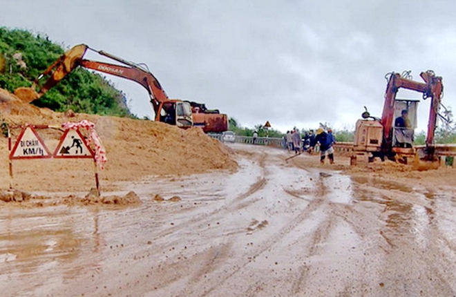 | Sở GTVT Phú Yên huy động xe cơ giới thu dọn hiện trường đất đá bồi lấp trên mặt đường Quốc lộ 29 ở xã Hòa Tâm, huyện Đông Hòa |