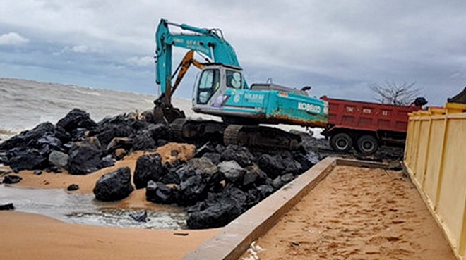 | UBND TP Tuy Hòa huy động phương tiện cơ giới đổ đá tàng để lập kè tạm chắn sóng |