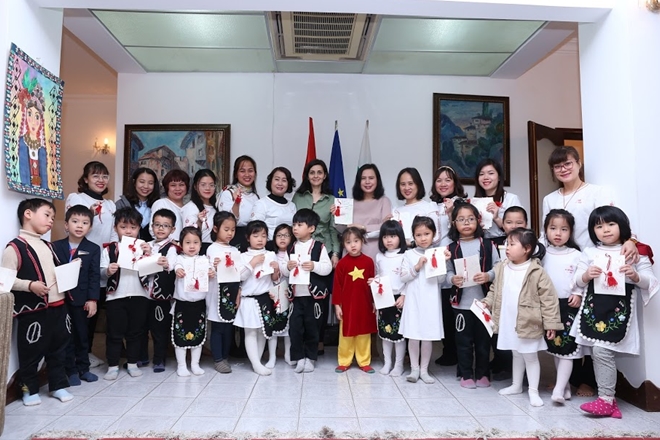 | Học sinh trường mầm non chất lượng cao Việt - Bun rất hào hứng được thăm Đại sứ quán Bulgaria. Ảnh: Việt Anh |