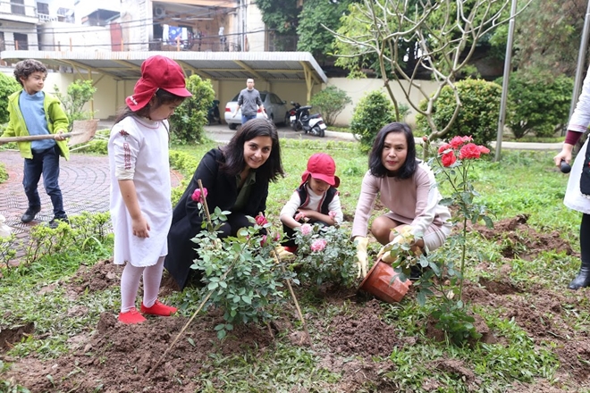 | Đại sứ Bulgaria Marinela Petkova và Hiệu trưởng Trường mầm non chất lượng cao Việt - Bun cùng trồng hoa với các bạn học sinh. Ảnh: Việt Anh |