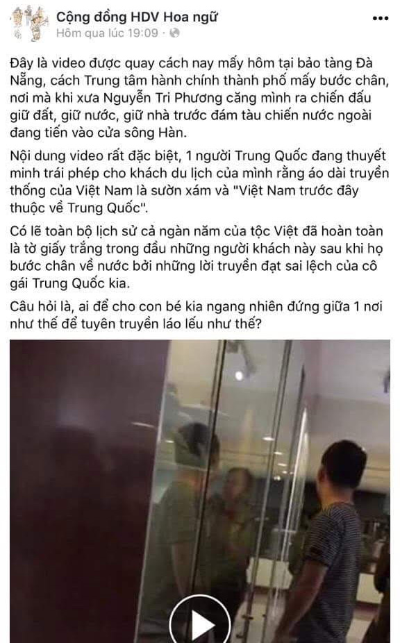 Hai ngày qua, trên trang Facebook của Cộng đồng hướng dẫn viên du lịch Hoa ngữ đăng tải một video ghi lại hình ảnh một phụ nữ được cho là hướng dẫn viên người Trung Quốc thuyết minh cho đoàn khách tại Bảo tàng Đà Nẵng.