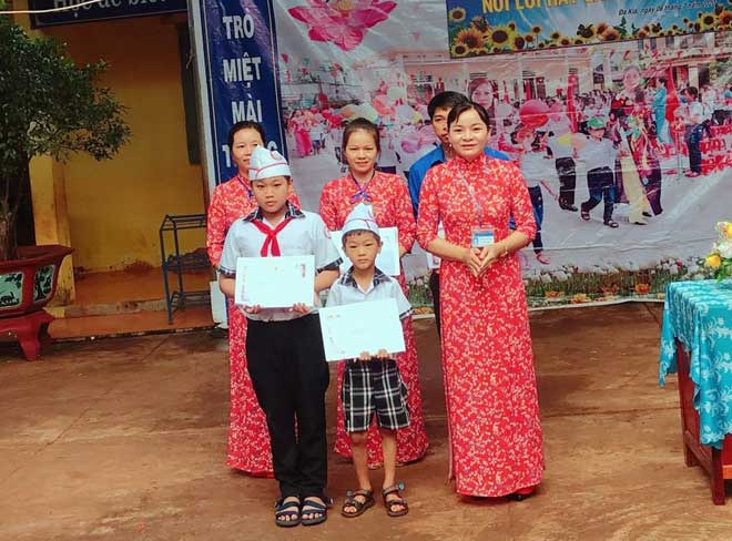 | Ban giám hiệu Trường Tiểu học Đa Kia B trao giấy khen và quà cho em Nhân (hàng trước, bên trái) |