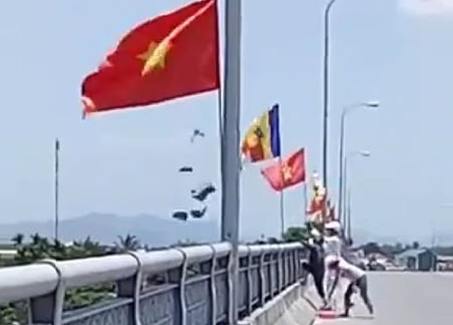 | Hình ảnh nhóm người đứng trên cầu chợ Dinh ném vàng mã xuống sông Hương. (Ảnh cắt từ clip). |