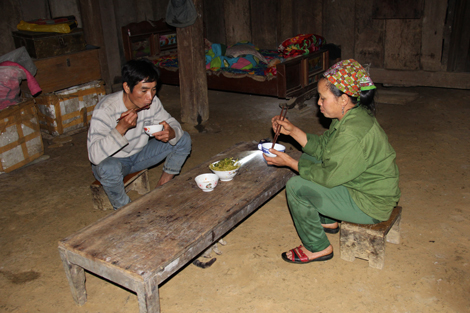 | Đời sống của dân bản Co Hào còn rất khó khăn vì không có điện lưới quốc gia. Trong ảnh: Vợ chồng anh Lý Văn Bình và chị Triệu Thị Hiền khi ăn cơm phải dùng đèn pin soi sáng. |