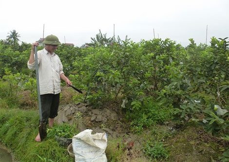| Bác Mạc Văn Anh vừa chặt một gốc ổi chết, và chuẩn bị đào hố để trồng các gốc ổi thay thế. |