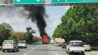 Xe khách bốc cháy ngùn ngụt trên đại lộ Thăng Long