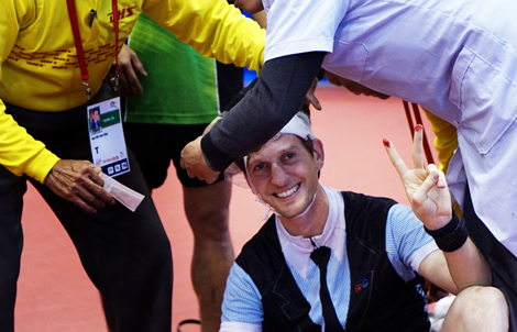 | Trong trận đấu biểu diễn với Kiện tướng bóng bàn Việt Nam Đoàn Kiến Quốc, tay vợt hài nổi tiếng Adam Bobrow đã gặp phải một chấn thương. Mặc dù với cái đầu chảy máu nhưng anh vẫn luôn khôi hài. |