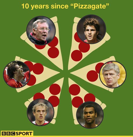 1. Ngày 24/10/2004, Man Utd tiếp đón Arsenal trên sân nhà Old Trafford. Đó được coi là một trong những trận đấu đáng nhớ nhất trong lịch sử giải Ngoại hạng Anh. Man Utd khi đó đã đánh bại Arsenal 2-0, trong một cuộc đấu căng thẳng. Và như một định mệnh nào đó, Man Utd chính là CLB cắt đứt chuỗi 49 trận bất bại của Arsenal. Thế nhưng, trận đấu này không chỉ đánh dấu cột mốc ấy, mà còn được nhắc đến với "vụ án chiếc bánh pizza" trong đường hầm dẫn ra sân. Báo chí Anh còn gọi, đây là "trận đấu buffet".