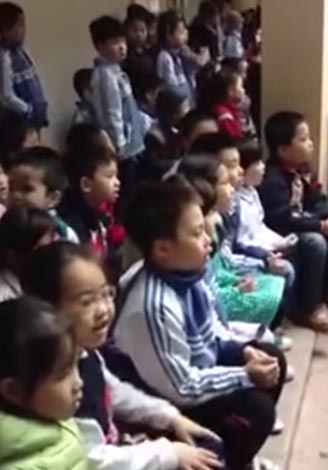 | Hàng trăm học sinh Trường Tiểu học Đông Thái (Hà Nội) say sưa hát "Chắc ai đó sẽ về" (Ảnh cắt ra từ clip). |