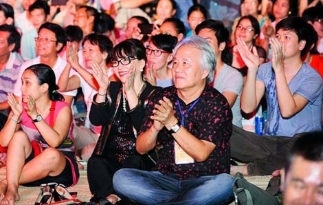 | Hai vợ chồng bà Trịnh Vĩnh Trinh - Nguyễn Trung Trực ngồi dưới khán đài theo dõi chương trình. |