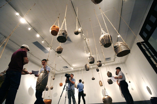 Những chum cà, vại tương, chĩnh mắm... những đồ dùng, vật dụng quen thuộc gợi nhớ ký ức của những người nông dân xưa được tái hiện trong hành trình “Tìm về ký ức” của nhà điêu khắc Thái Nhật Minh.