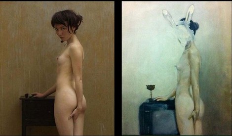 | Bức tranh Cô gái Thỏ (phải) của họa sĩ Nguyễn Phan Bách bị tố là đạo tranh của họa sĩ Pháp Louis Treserras (trái). |