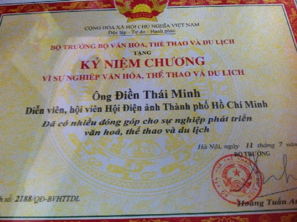 | Kỷ niệm chương Bộ Văn hóa – Thể thao và Du lịch tặng diễn viên Điền Thái Minh. |