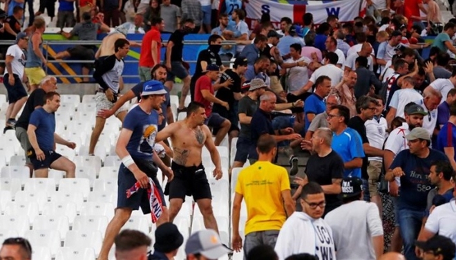 | Cổ động viên Nga truy đuổi người Anh trên khán đài. |